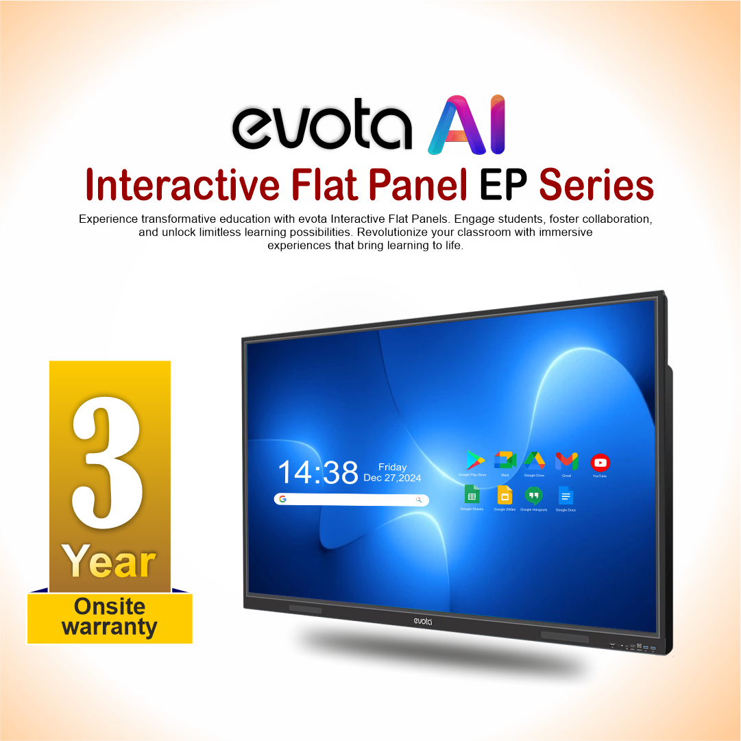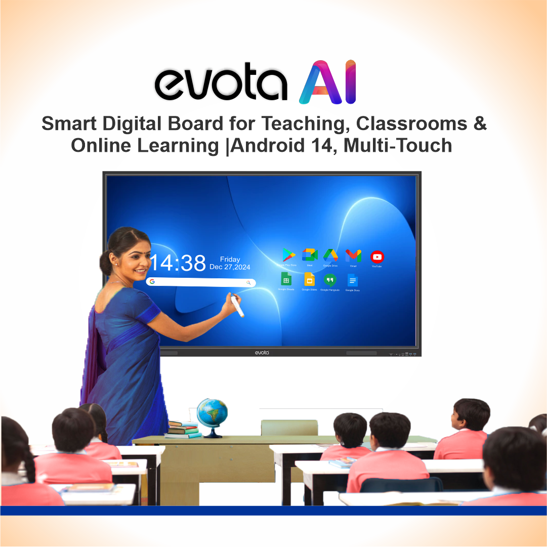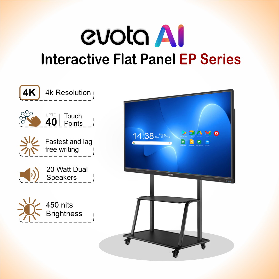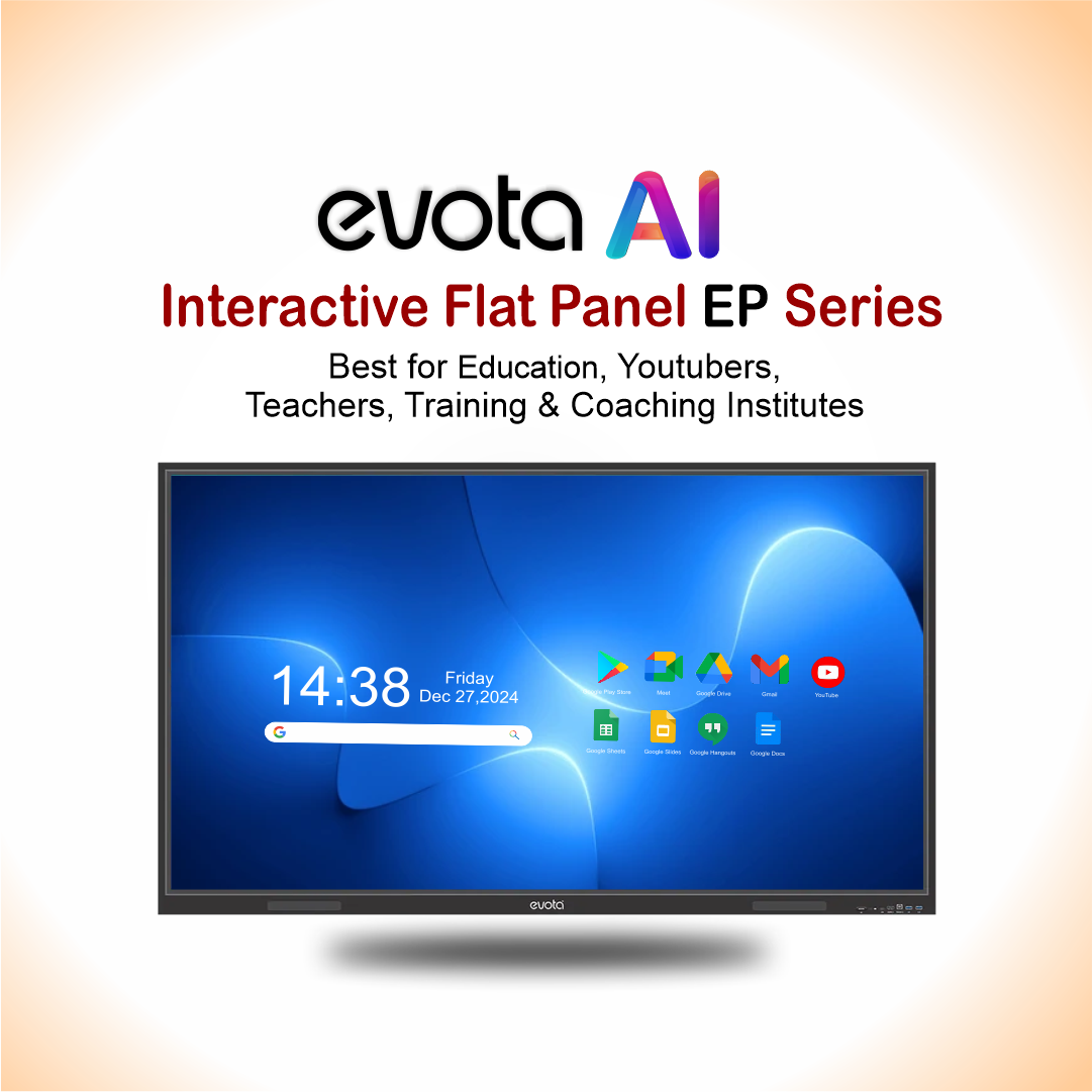 The Evota Multi-Touch Interactive Display is designed to transform classrooms, meeting rooms, and boardrooms into collaborative smart spaces. With 4K Ultra HD resolution, Android 14 OS, and 40-point multi-touch precision, it ensures an intuitive and engaging user experience. Perfect for teaching, training, video conferencing, and business presentations, this AI-powered digital board enables annotation, wireless collaboration, and lecture recording without the need for an external PC.